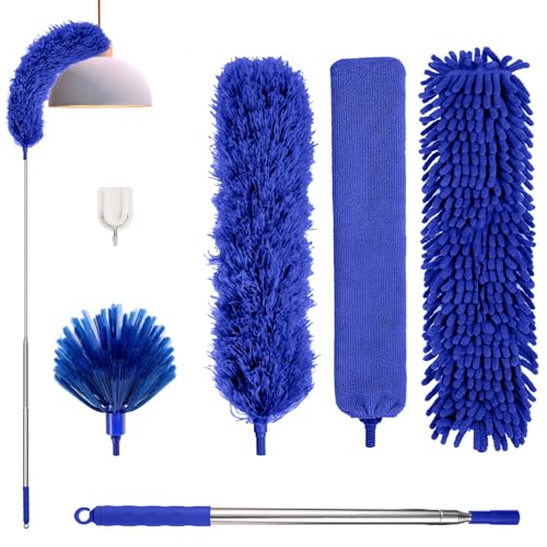 Fogray Extendable Feather Duster, Bendable Microfiber Dusters with Extra Long Telescopic Extension Pole and Soft Silicone Cap, Washable for Cleaning Roof, High Ceiling Fan, Blinds(Dark Blue)