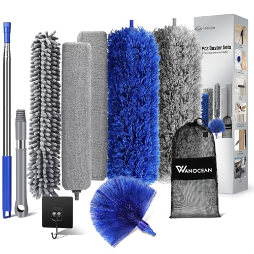 Feather Duster,7 PCS Extendable Duster with Extension Pole Up to 100 Inch, Reusable Bendable Cobweb, Washable Long Duster for Cleaning Ceiling Fan,High Ceiling,Furniture