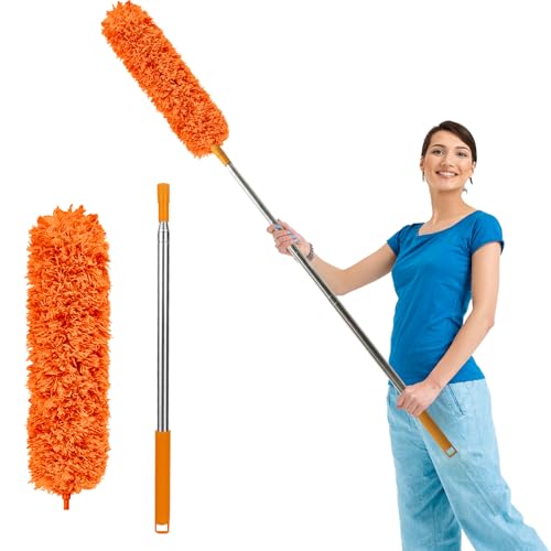 Fogray Extendable Feather Duster, Bendable Microfiber Dusters with Extra Long Telescopic Extension Pole and Soft Silicone Cap, Washable for Cleaning Roof, High Ceiling Fan, Blinds(Orange)