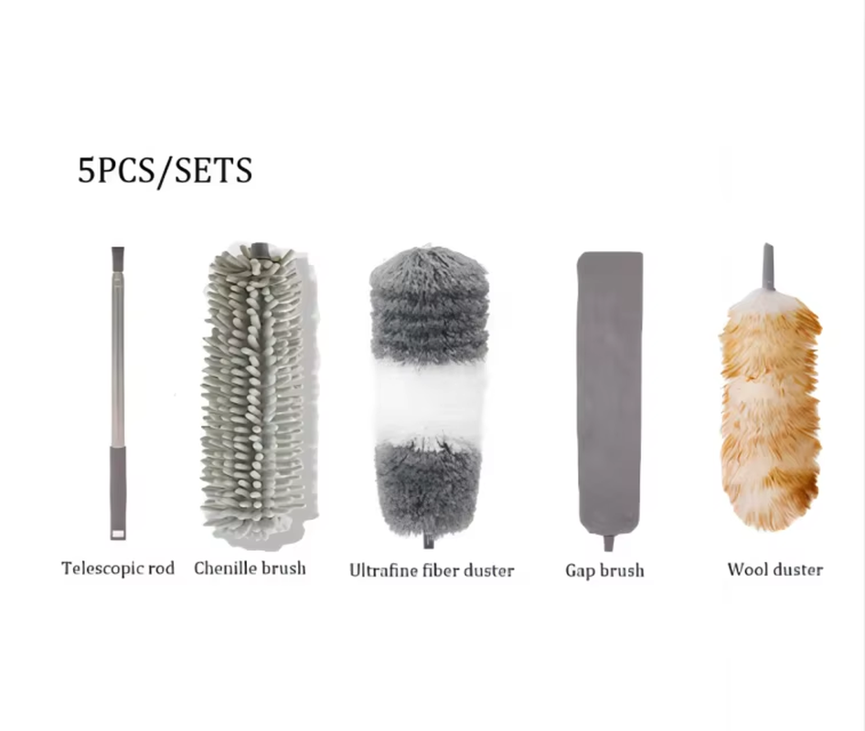 Fogray Extendable Feather Duster Kit - Long Handled 100" Telescopic Pole and Soft Silicone Cap, Bendable Washable Heads for Cleaning Cobwebs, High Ceiling Fans, Roof, Furniture & Cars(5Pcs-Grey)