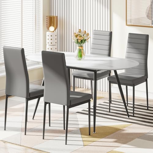 Luxstein Extendable Dining Table and Chairs Set 4, High Back Grey PU Chair with Oval White Marbel Effect Large Kitchen Table for Dining Room, Kitchen
