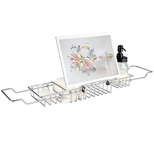 HOMEE Bathtub Tray - Stainless Steel Shower Caddy Tray with Removable Book Holder, European Style Extendable Bathtub Caddy Tray for Shower Bath Phone IPad Book Holder Candleholder Table Shelf - Sliver