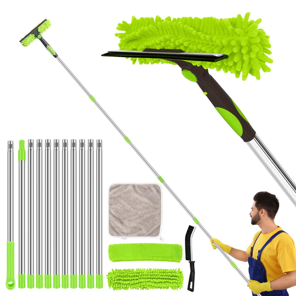 13.2Ft Extendable Window Cleaner, 2-in-1 Window Cleaning Equipment, Telescopic Long Window Cleaning Tool for High Windows, Home and Office Use, with 2 Microfiber Cloth & Squeegee Blade (Green)