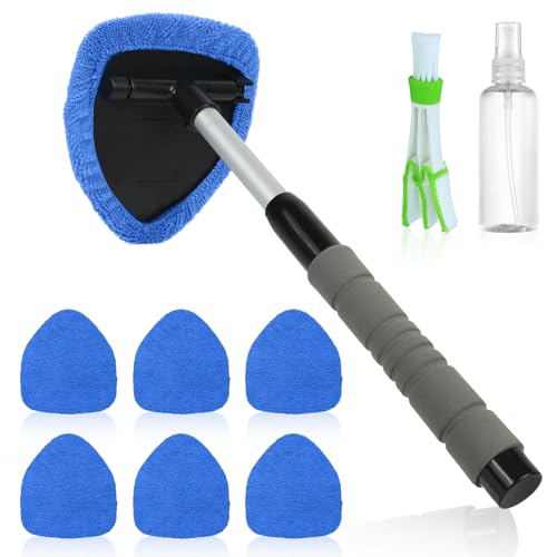 AMFUN 6 Pcs Car Windscreen Cleaner, Car Window Cleaner Kit with 5 Reusable Microfiber Pads, 1 Spray Bottles,Extendable Long Handle, Windshield Cleaning Tool, Auto Glass Wiper Office Home(Triangle)