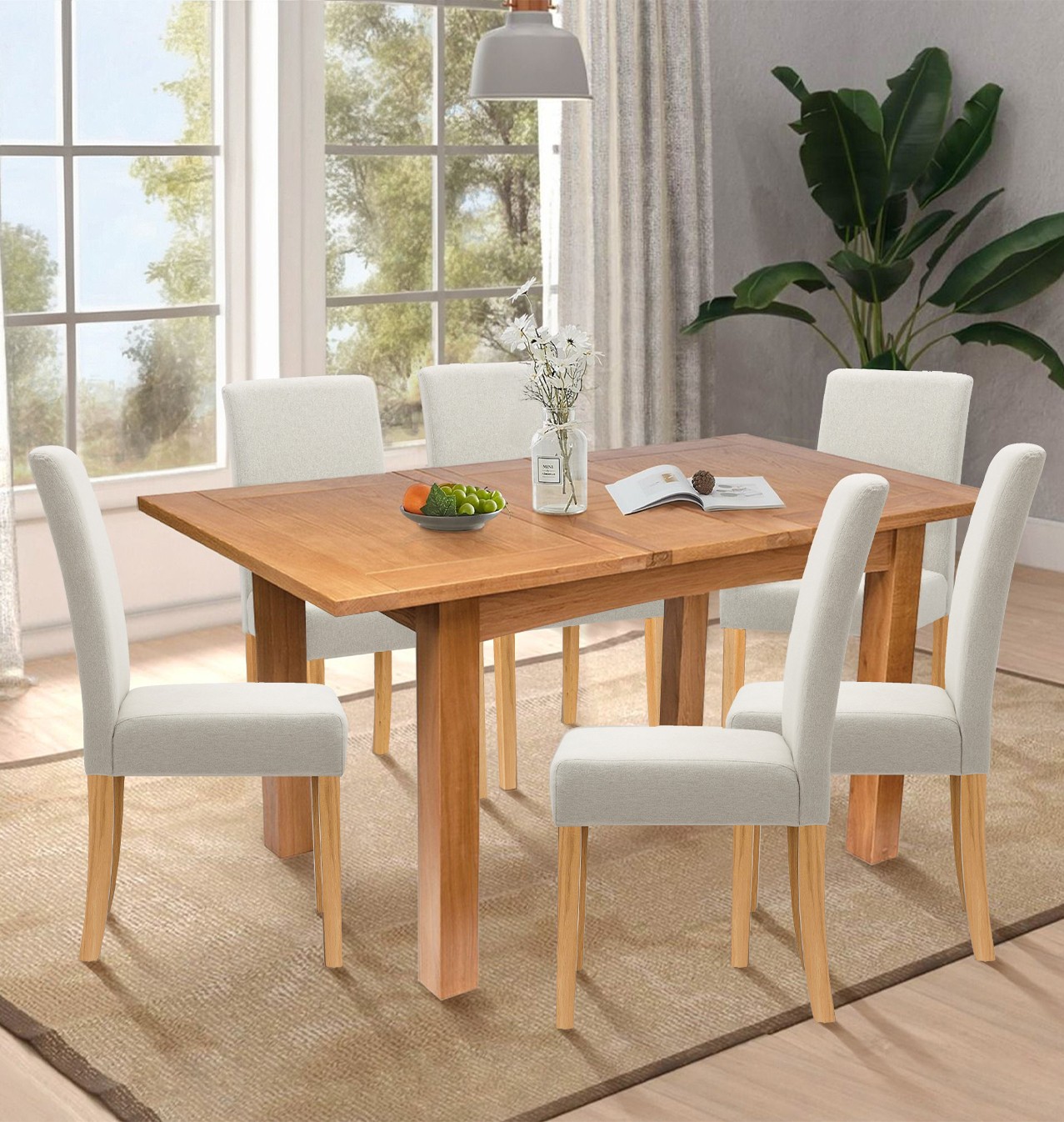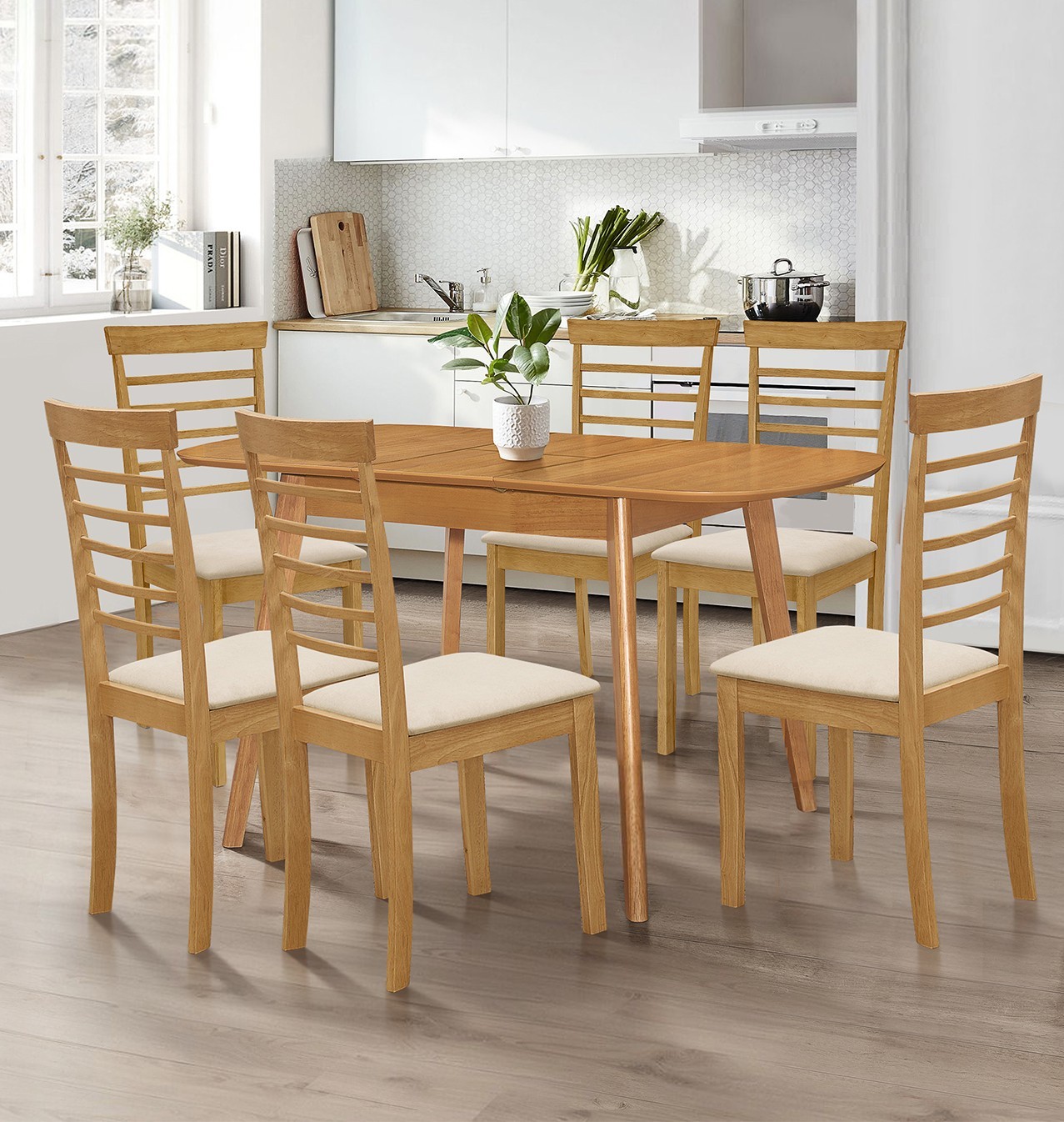 Dining Set, Butterfly Extending Kitchen Table & 6 Wooden Dining Chair, Light Oak