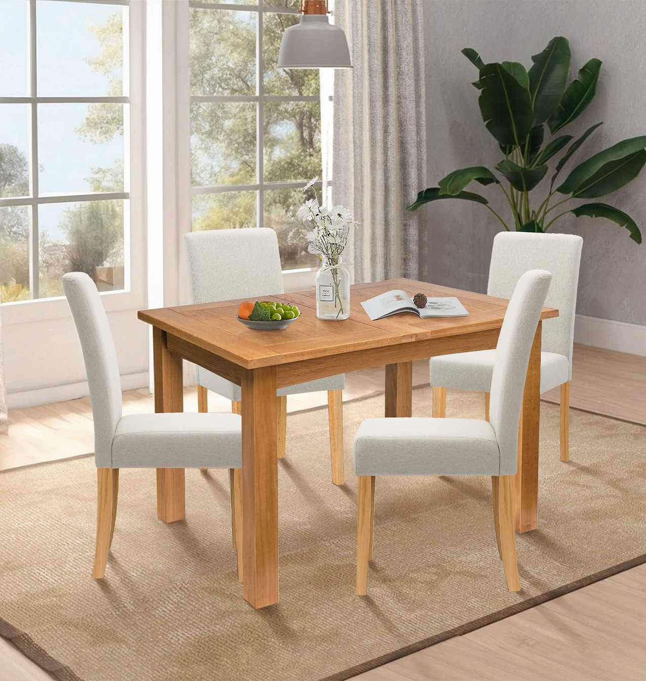 Hallowood Furniture Waverly Oak Extendable Dining Table and Chairs Set 4, Rectangular Small Kitchen Extending Table and Chairs in Straight Back and Upholstered Beige Fabric for Home and Café