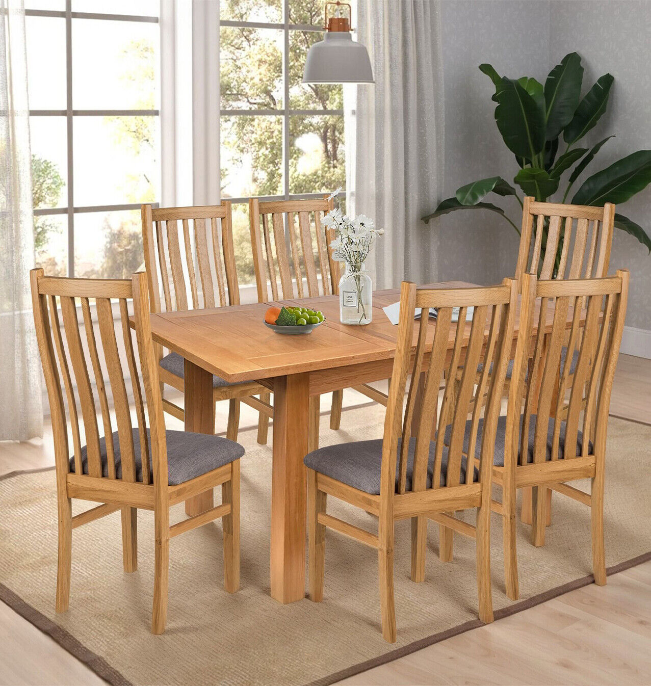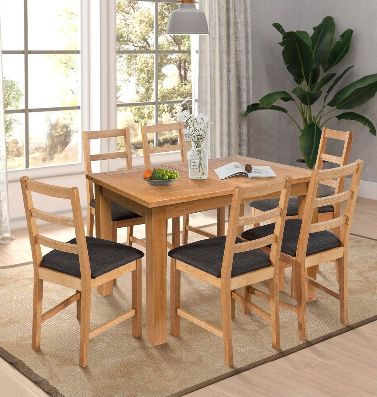 Dining Set, Extending Kitchen Table & 6 Ladder Back Oak Chairs (Charcoal Seat)