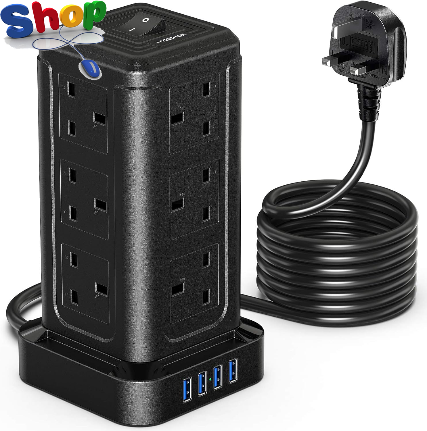 NVEESHOX Extension Lead Surge Protection, 12 Way Power Strip Tower with 4 USB Slots 5M/16FT Long Extension Cord Multi Plug 2500W Overload Protection for TV PC Laptops iPhones Tablets (Black-5M)