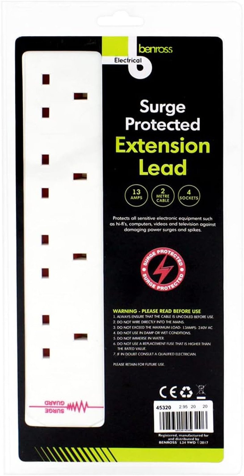 45320 4-Way Extension Cable / 2 Metre Extension Lead/Surge Protection/Ideal for