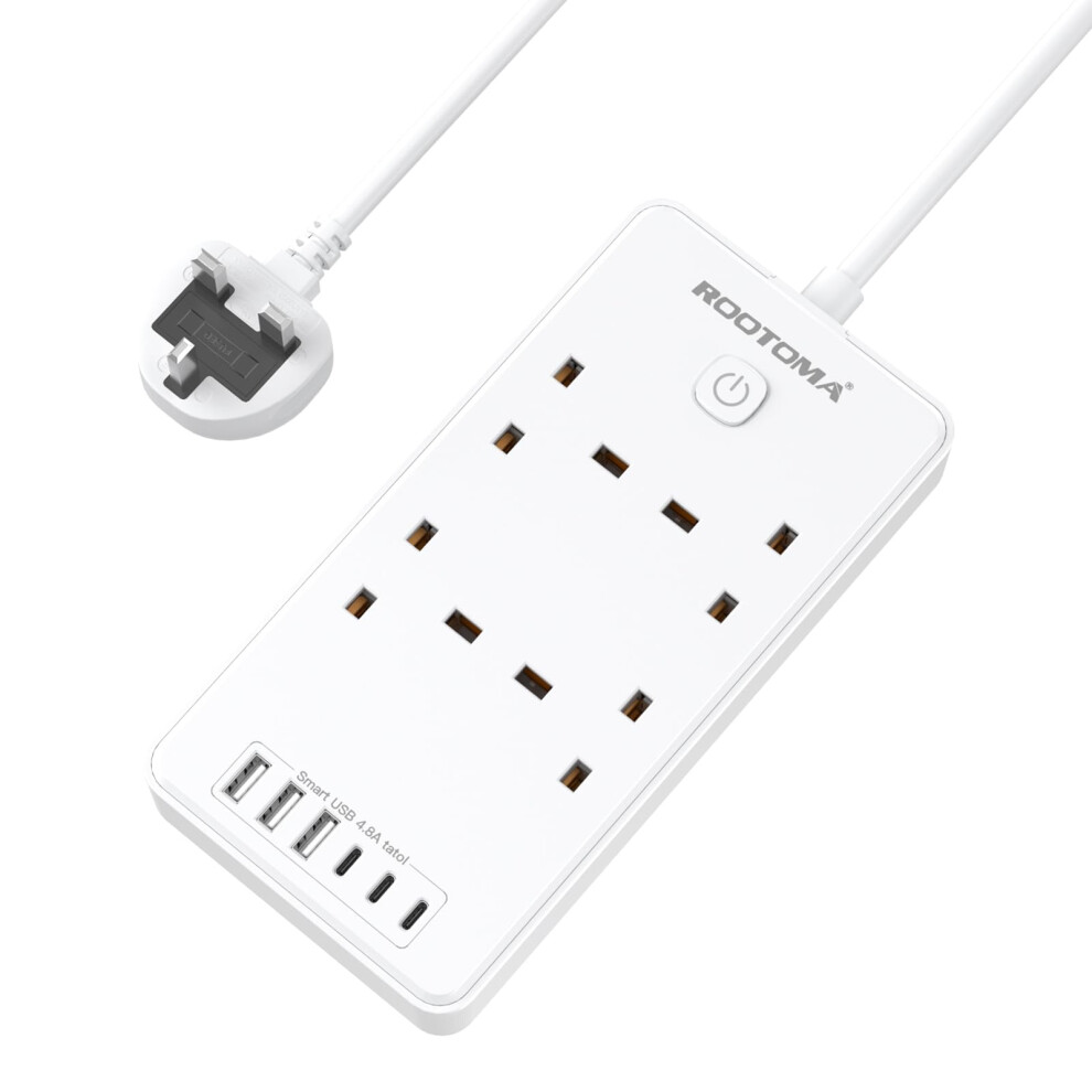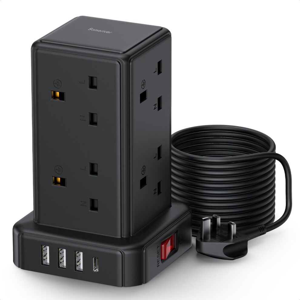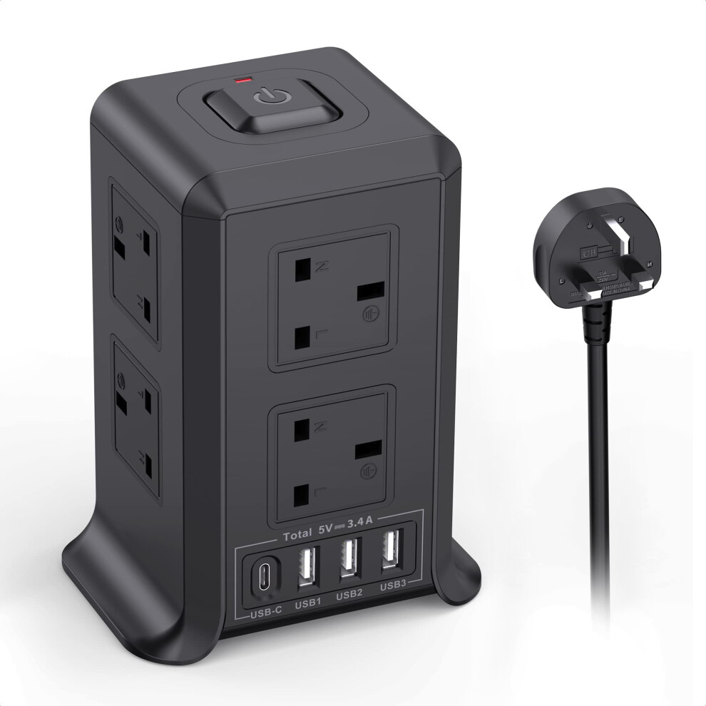 Tower Extension lead Surge Protection Extension Lead with Switch (13A 3250W) 8 AC Outlets & 4 USB Ports Plug Extension Socket Extension Cable 2M Mini