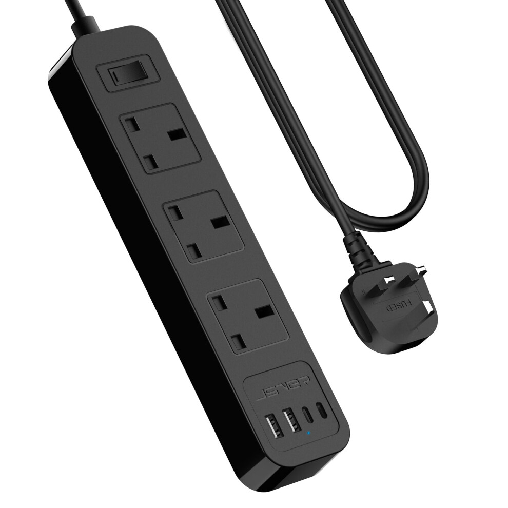 JSVER Extension Lead with USB C Slots, Power Strip with 3 Way Outlets and 2 USB C Fast Charger(5V 3.4A), Extension Lead with Switch, 2M Extension Cab