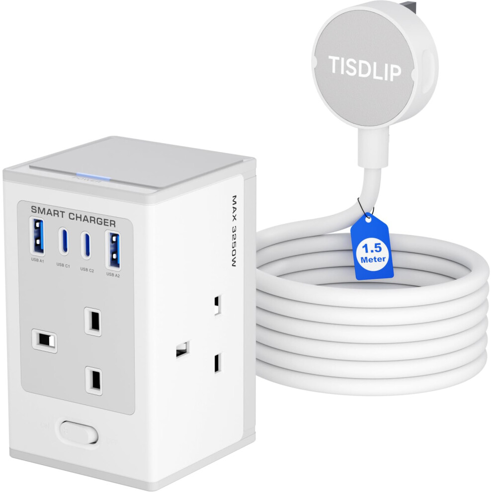 Tower Extension Lead with Switch 1.5 Metre 4 Socket Extension Cable with USB Slots 30W Fast Charging USB C Port