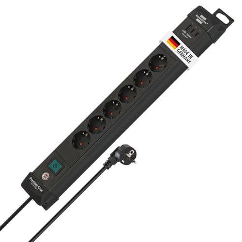 Brennenstuhl Premium-Line 6-way Power Strip with 2x USB C PD 65W and USB A 18W (Made in Germany, Extension Lead with switch, 3m cable and Safety Fuse Button, Power Extension for wall mounting) black