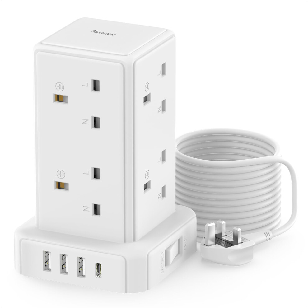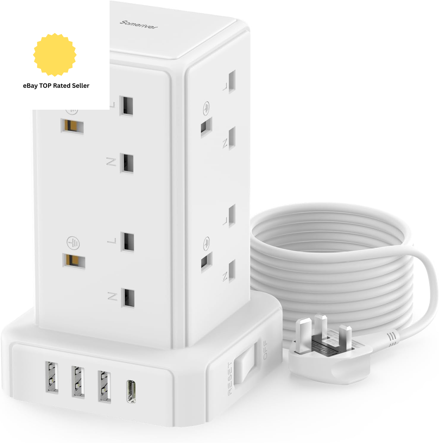 Tower Extension lead 3M, [13A 3250W] Surge Protection Extension lead with Switch, 8 AC Outlets & 4 USB Ports Plug Extension Socket, Extension Cable 3M