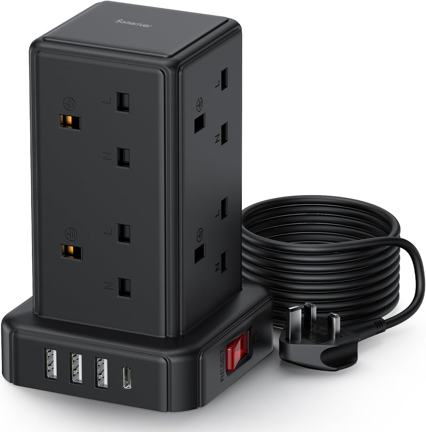 Tower Extension lead 3M, [13A 3250W] Surge Protection Extension lead with Switch, 8 AC Outlets & 4 USB Ports Plug Extension Socket, Extension Cable 3