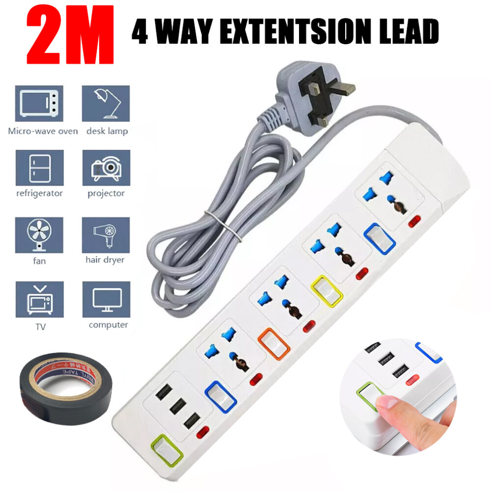 Mains Extension Lead Individual Switch UK Plug Sockets 2m Cable 4 Gang Way 3 USB