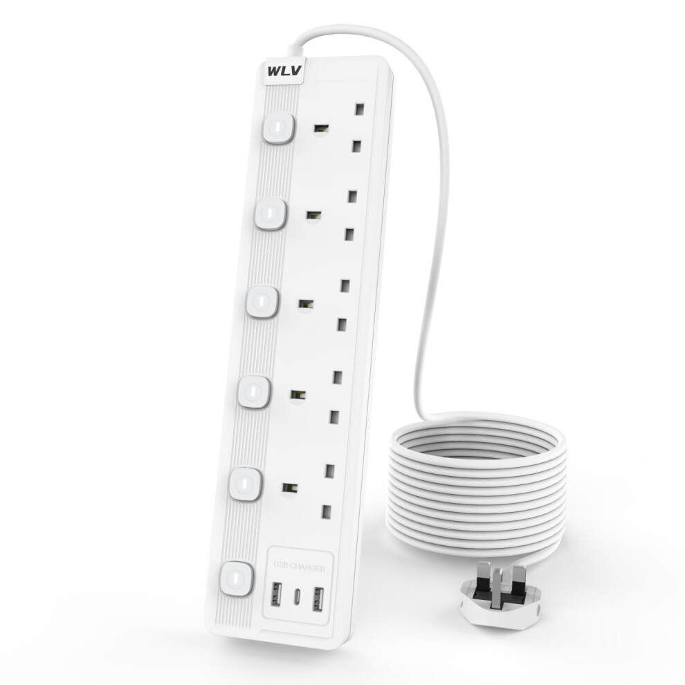WLV 3M Extension Lead 5 Gang with 3 USB Slots, White Extension Lead with Individually Switch, Wall Mounted Power Strip for Dorm, Kitchen, Living Room,