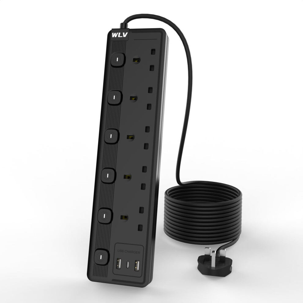 WLV 3M 5 Gang Extension Lead with 3 USB Slots, Black Extension Lead with Individually Switch, Wall Mounted Power Strip for Dorm, Kitchen, Living Room,