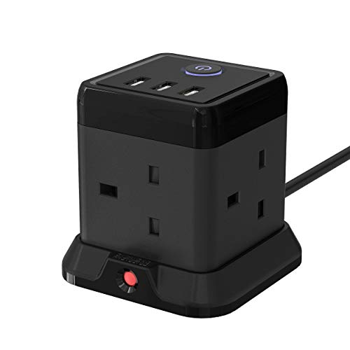 Cube Extension Lead with 3 USB Slots 13A 3250W Hulker 4 Gang Plug Socket with Switch 4 Way Power Strip with 3 USB Port 1.5M Extension Cord Black for Home Dorm Office Travel