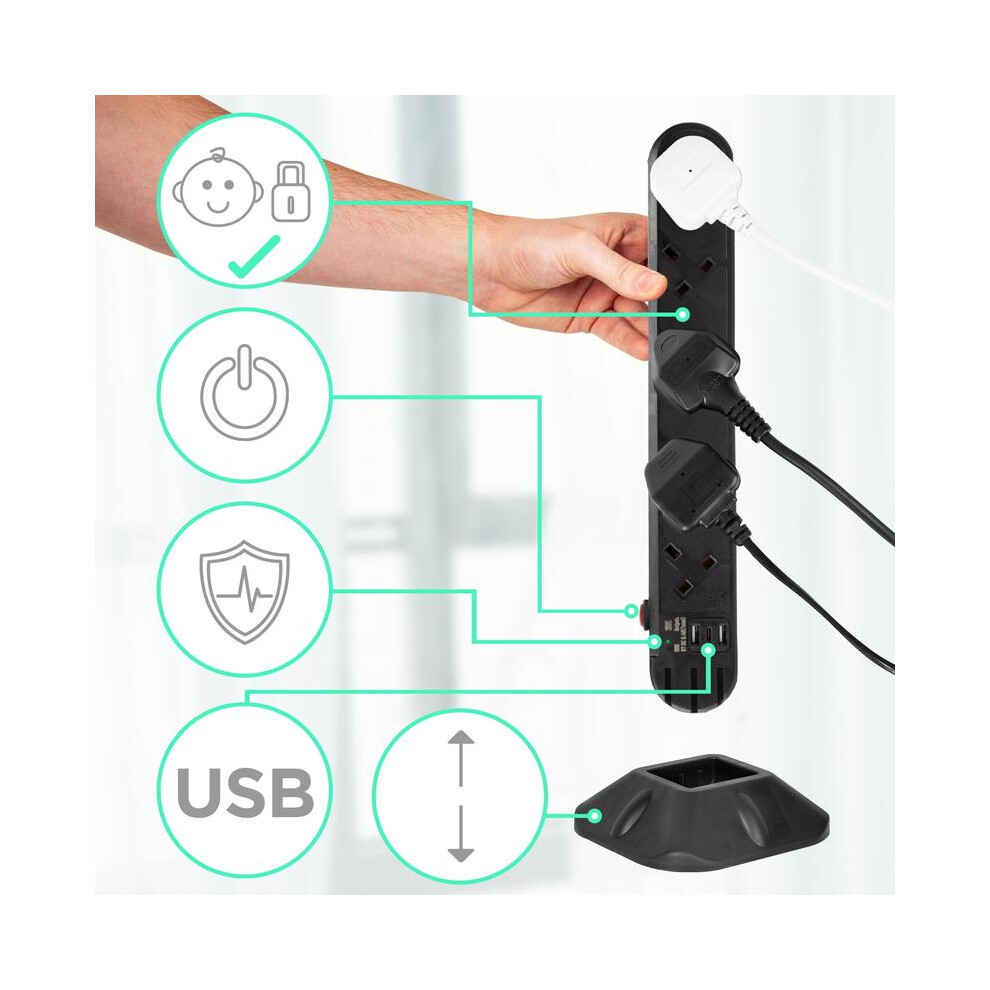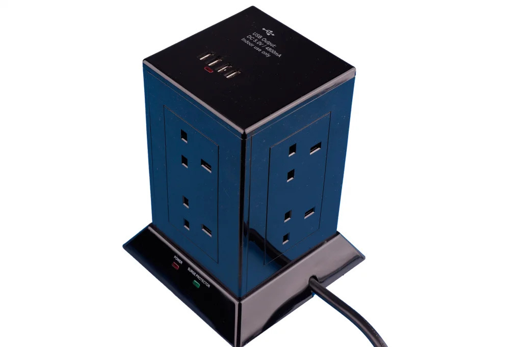 Mains Extension Leads Adaptors & Power Hub Black Surge Protected 8x13A + 4xUSB