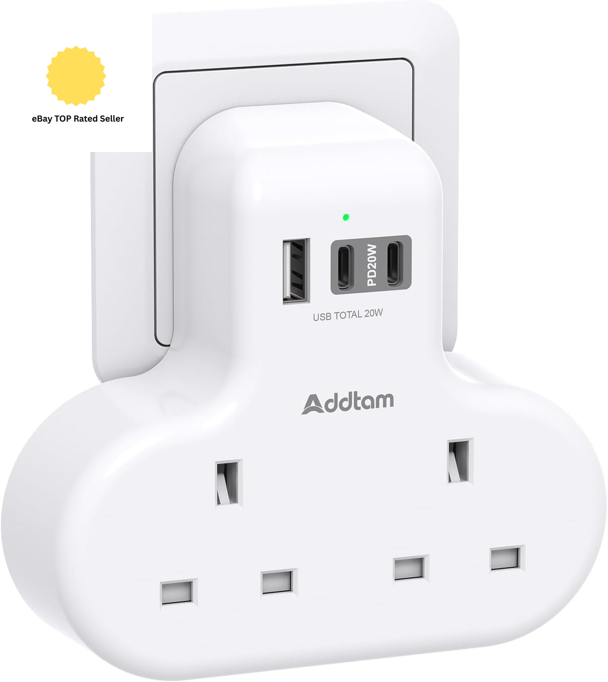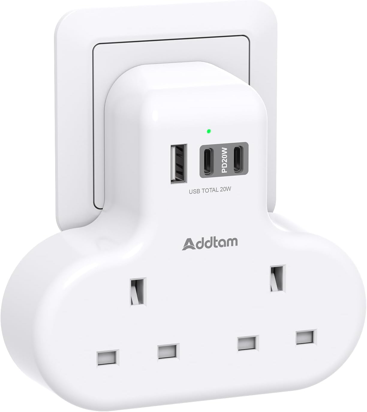 Addtam Double Plug Extension with 3 USB Ports (2 USB-C), 2 Way Multi Plug Adaptor, 13A UK 3 Pin Socket Extension for Home, Office, Travel and School