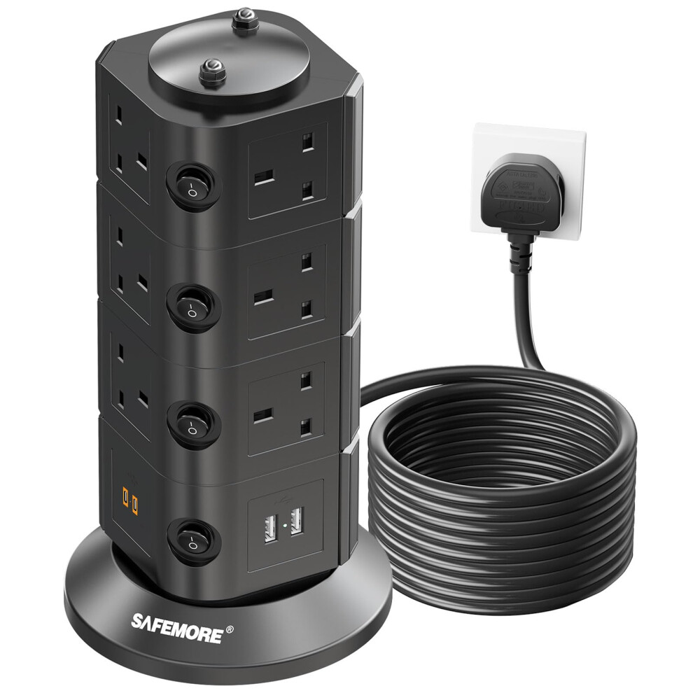 SAFEMORE Tower Extension Lead 14 Way, Extension Plug with 4 USB (2 USB-A / 2 Type-C) 4.8A Charge Slots, Individually Switched Power Strip 2m Cable Ve