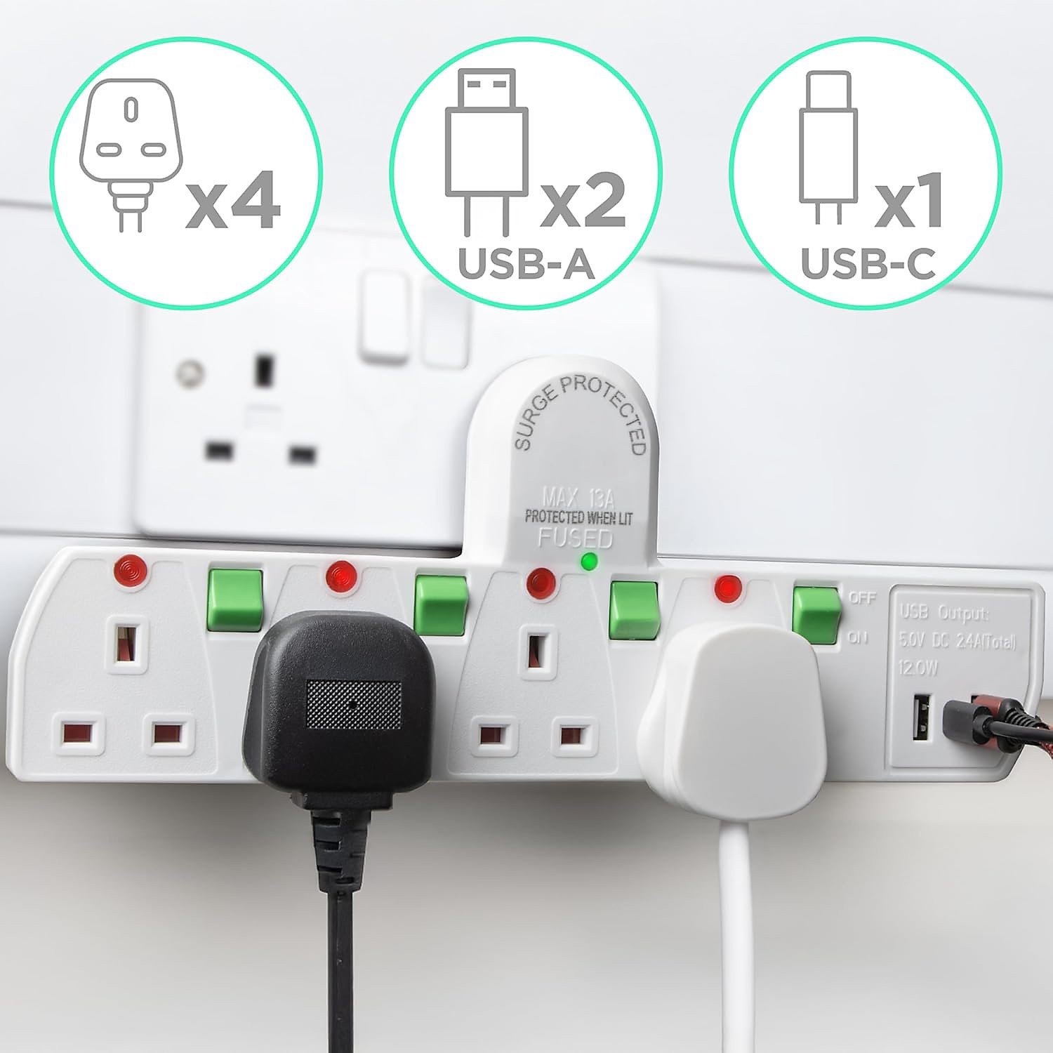 Mscien Multi Plug Extension Socket with USB, 4 Way 4 Way+USB, Mz0617646