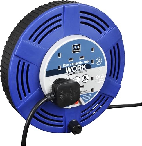 Masterplug Four Socket 15 Metre Cassette Reel, Large Extension Lead Cable Reel, Wind-Up Retractable Power Cord Reel, Thermal Cut Out, Work Power, Blue/Black, 10A, 4G, 15m, LCT1510/4BL