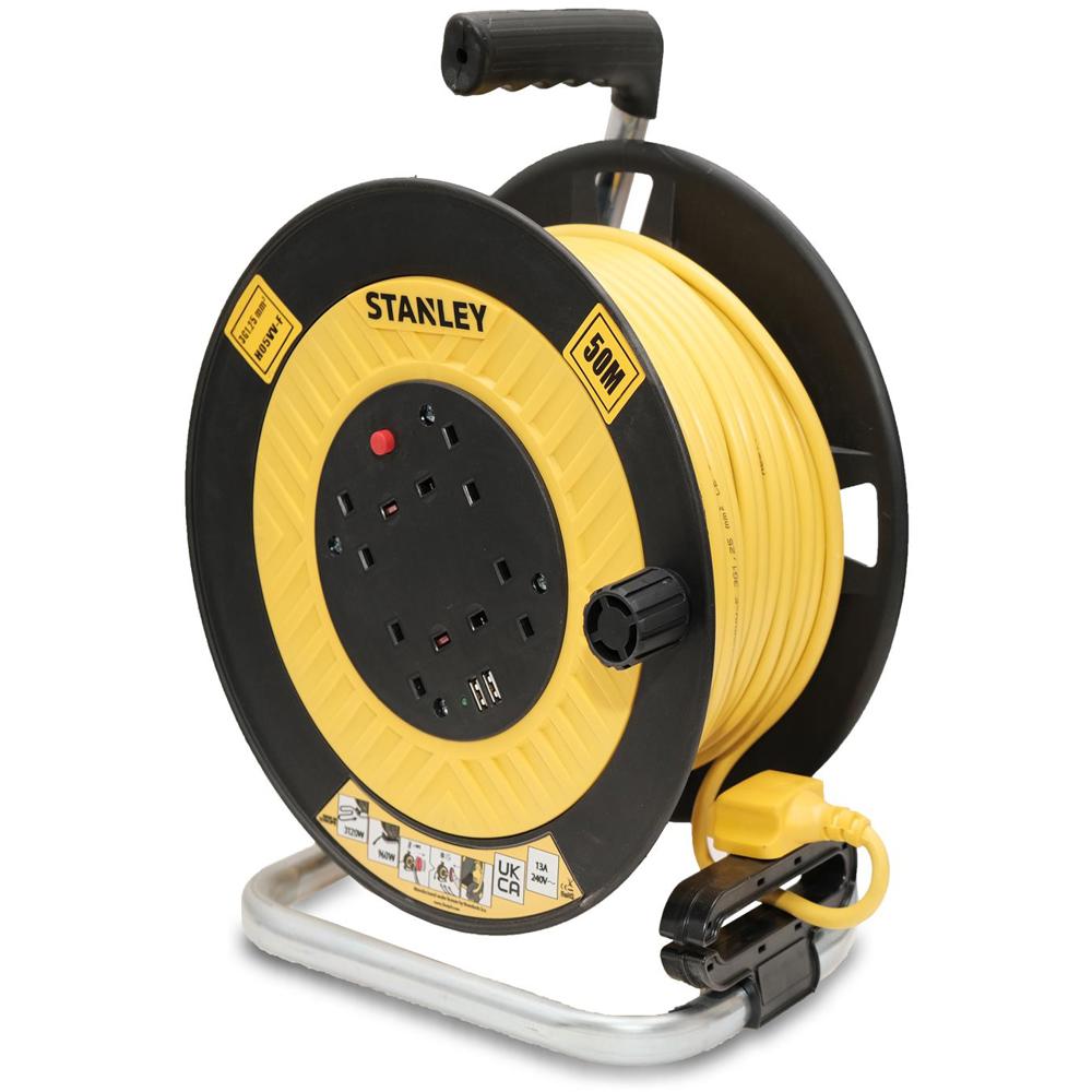 Stanley 6 Socket Open Drum Cable Extension Reel 240v and USB 50m