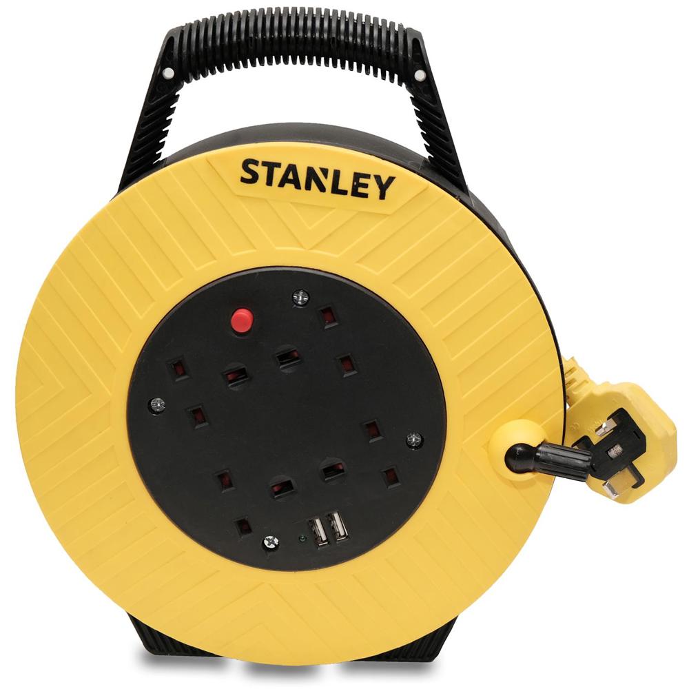Stanley 6 Socket Open Drum Cable Extension Reel 240v and USB 25m