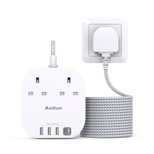 5M Extension Lead, Power Strips with 2 Way Outlets 4 USB (4.5A, 1 Type C and 3 USB A Ports) Surge Protection Plug Extension Socket with Braided Extension cord for Home/Office