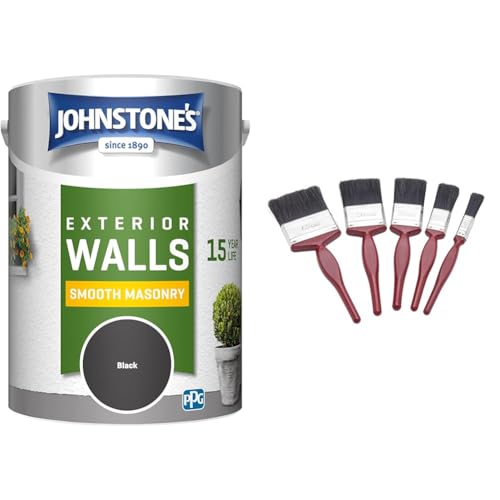 Johnstone's, Exterior Smooth Masonry Paint, Black, Up to 15 Years Protection, Weather & Fit For The Job 5 pc Mixed Sizes Paint Brush Set for a Smooth Finish with Emulsion, Gloss