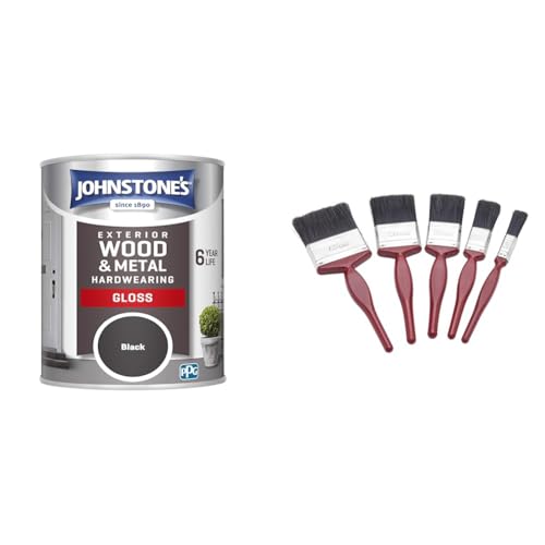 Johnstone's Exterior Hardwearing Gloss - Black 750ml & Fit For The Job 5 pc Mixed Sizes Paint Brush Set for a Smooth Finish with Emulsion, Gloss