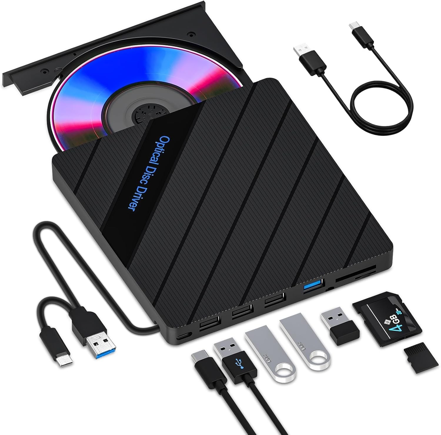 External CD/DVD Drive for Laptop – 7-in-1USB Portable CD/DVD Player Burner, High-Speed External Disk Drive with SD/TF Card Reader, 4 USB 3.0 Ports, Compatible with Windows 11/10, Linux, Mac (7 IN 1)
