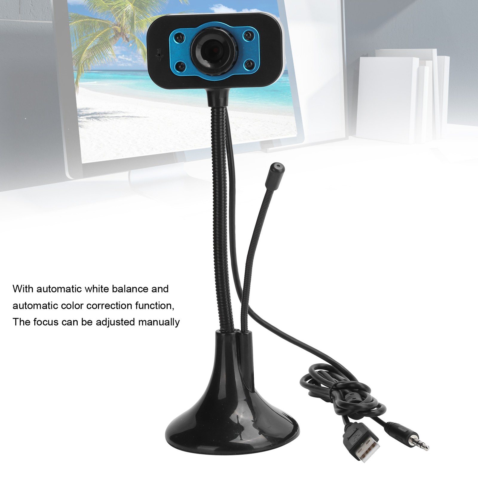Goshyda Webcam, Camera 4 LED Light 640 X 480 Pixels External Microphone Camera Video Webcam Drive‑Free Manual Focus Adjustment Camera with Free Angle Adjustment