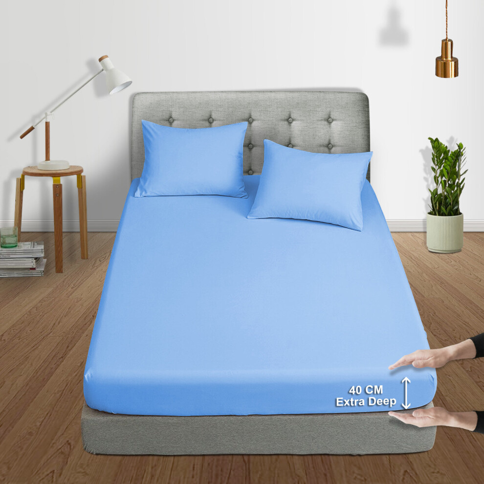 (Sky Blue, Single) Extra Deep 40cm Fitted Bed Sheets Poly Cotton Single Double King Size