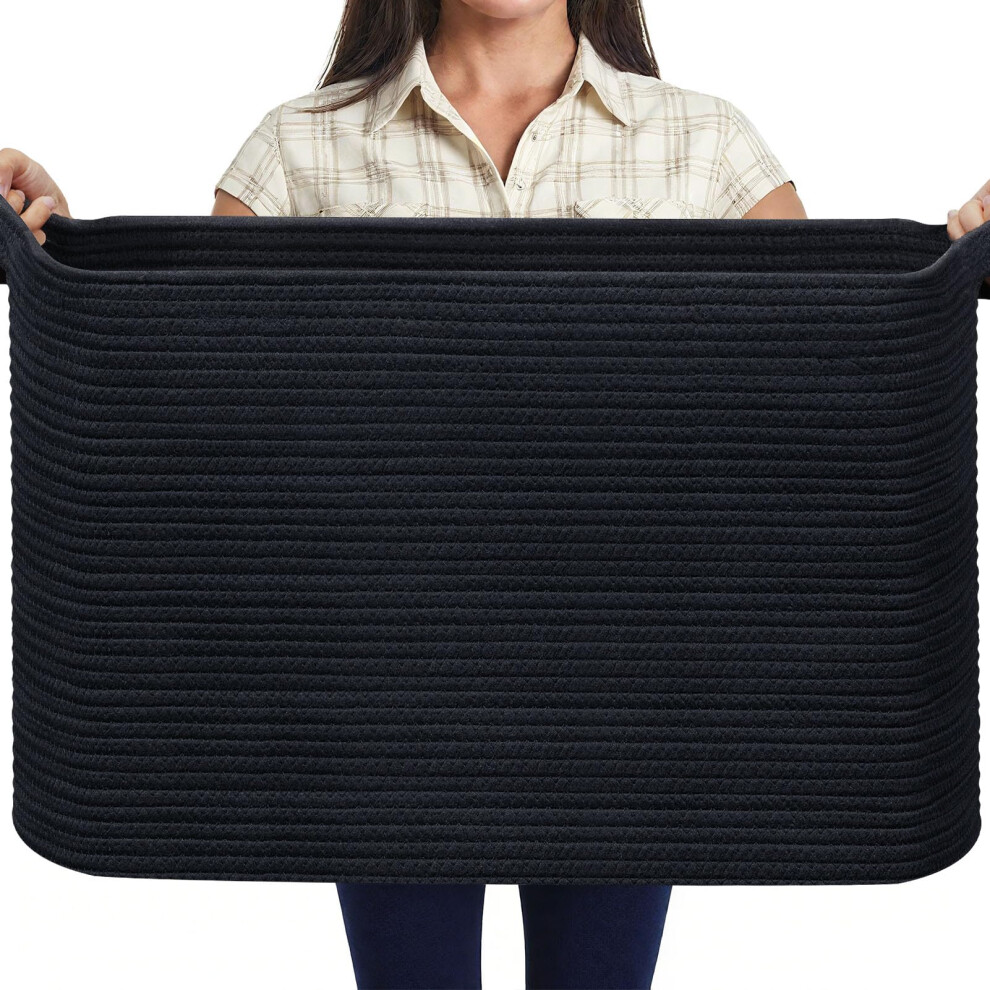 MEGASKET Extra Large Rectangle Storage Basket, 23.6" x 15.7" x 14.1" Black Blanket Storage for Living Room, Large Soft Woven Cotton Rope Organizer, Kids Toy Bins, Wicker