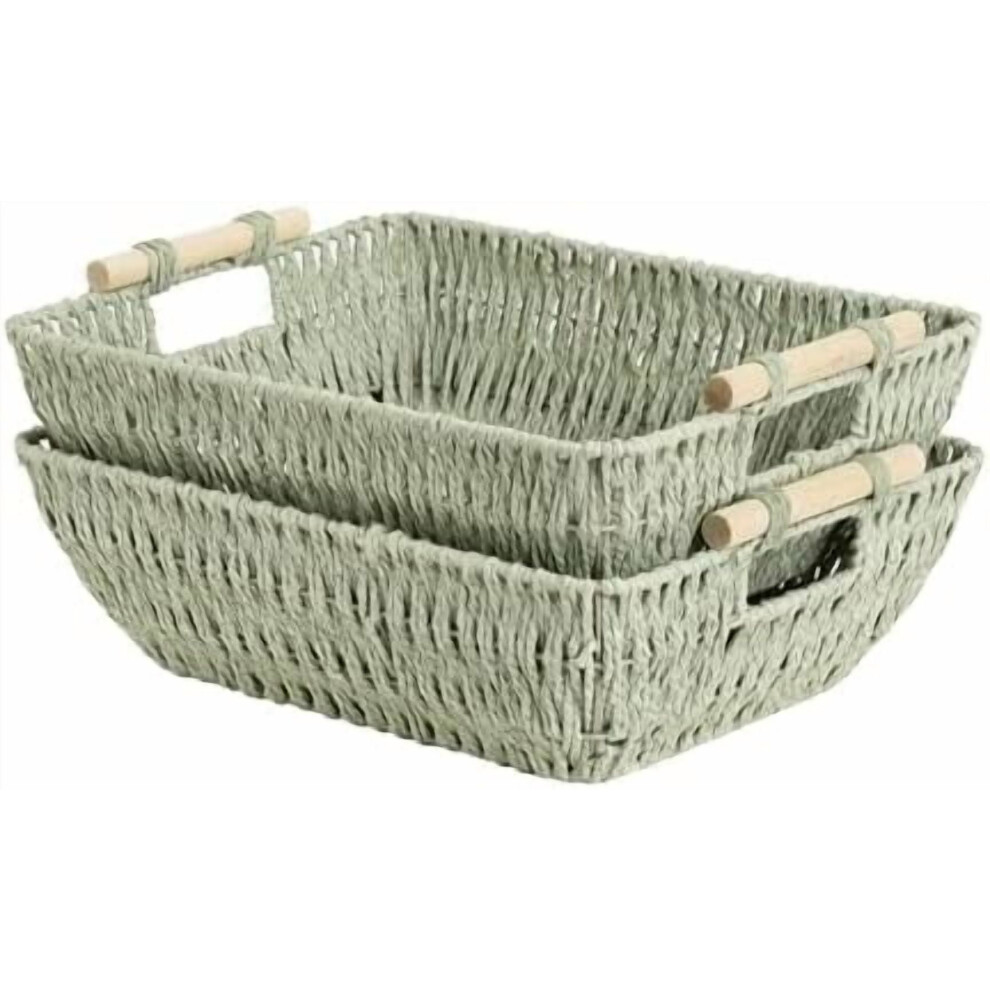 Extra Large Wicker Storage Basket for Organizing with Wooden Handles, Toilet Paper Baskets for Shelf, Bosana Green, 2-Pack