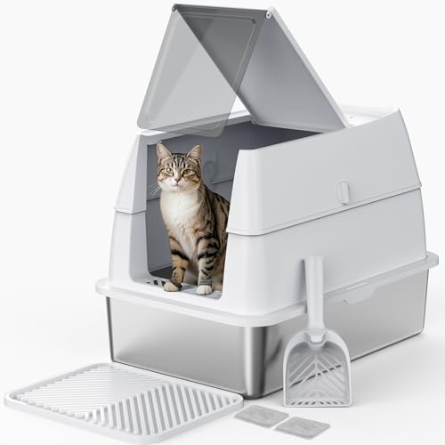 Papettly High Sided Stainless Steel Litter Box with Lid, Extra Large Cat Litter Trays Hooded Cat Litter Box, Enclosed Litter Box for Big Cats with Cat Litter Mat, Scoop, Brush, Easy Clean, Detachable