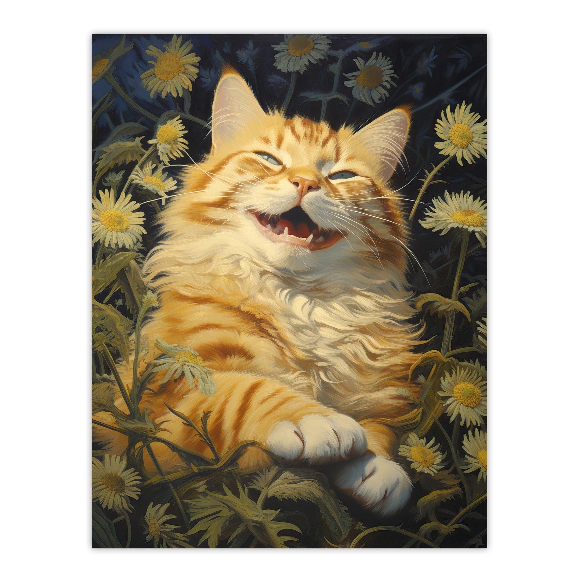 Contented Grinning Ginger Cat Wildflower Meadow Oil Painting Extra Large XL Unframed Wall Art Poster Print
