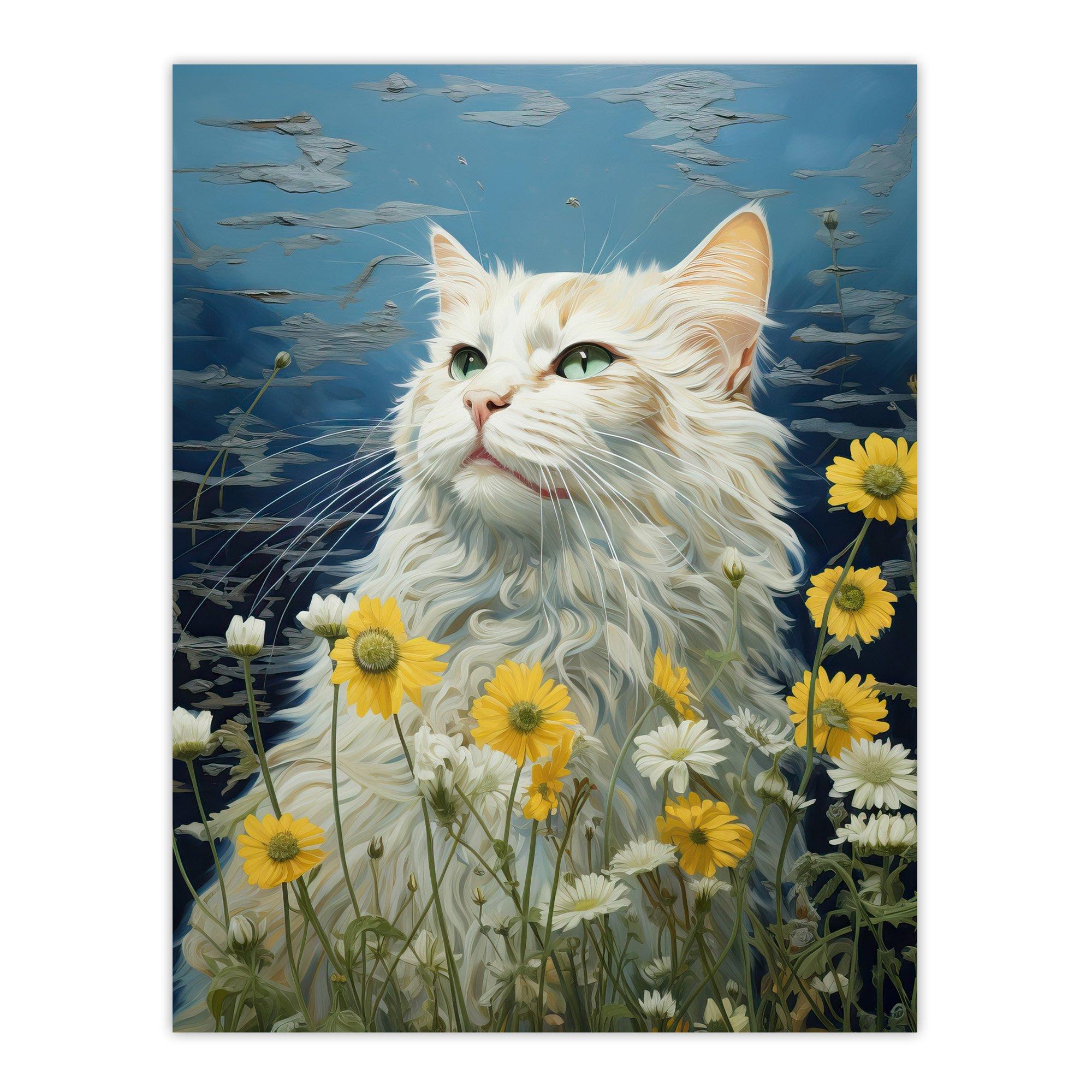 White Cat In The Wildflowers Floral Meadow Oil Painting Norwegian Forest Cat Extra Large XL Unframed Wall Art Poster Print