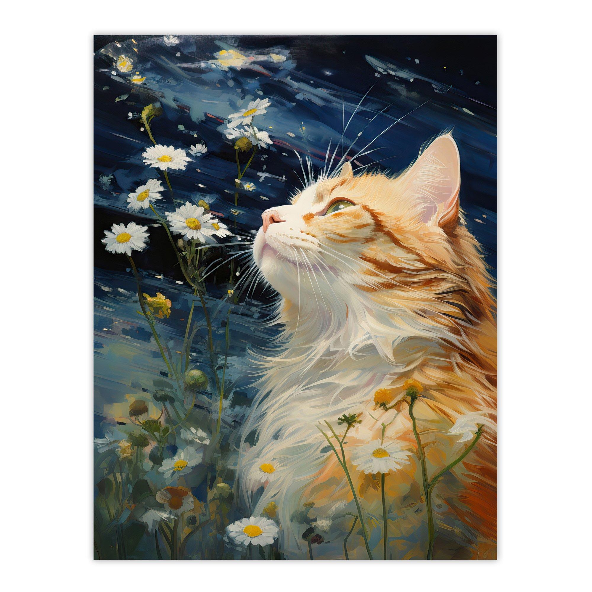Moonlit Cat In Daisy Meadow Norwegian Forest Cat Oil Painting Extra Large XL Unframed Wall Art Poster Print