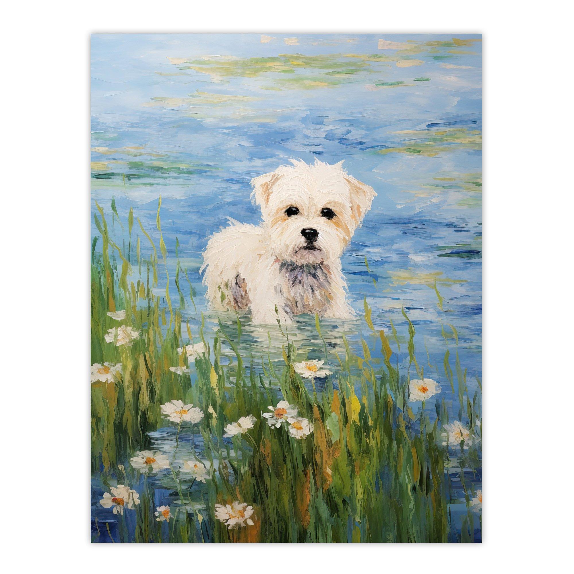 Maltese Dog Claude Monet Style Oil Painting Portrait In Lake By Wildflowers Extra Large XL Unframed Wall Art Poster Print