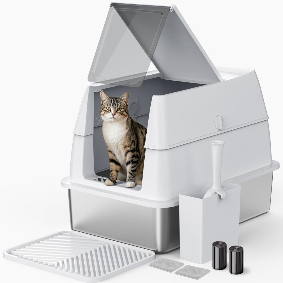 Citylife XL Stainless Steel Cat Litter Tray with Lid, Extra Large Enclosed Metal Litter Box with Litter Scoop&Double Layer Litter Mat, Non-Sticky, Non-Odor, Easy Cleaning, for Big Cats