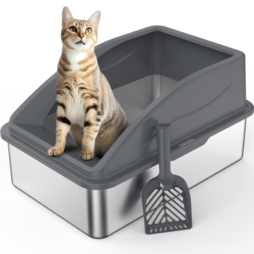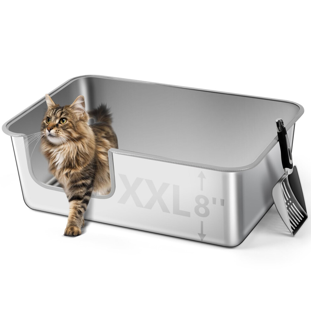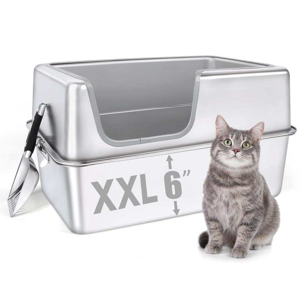Cat Litter Box extra Large Metal Cat Litter Tray Stainless Steel Cat Litter Tray Box, Splashproof, High Sided Cat Litter Tray with Litter Scoop and