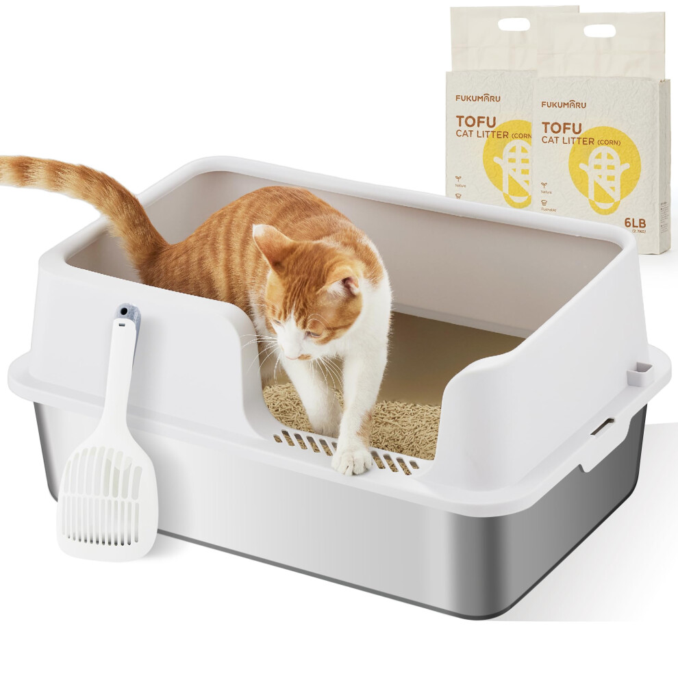 FUKUMARU Stainless Steel Litter Box, High Side Metal Cat Litter Box with Two Bags Litter, Extra Large Enclosed Litter Tray with Lid for Big Cats,