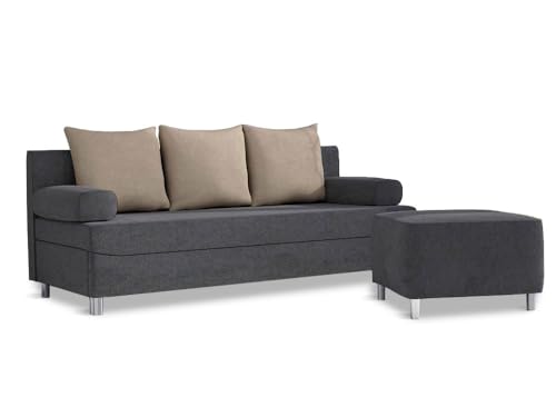 FURNIPOL DOVER WITH POUFFE WITH EXTRA PILLOW 3-Seater Sofa – Folding Bed Function, Large Storage Box, Loose Back Cushions, Stylish Upholstery – 192×80×80 cm – Dark Grey + Beige