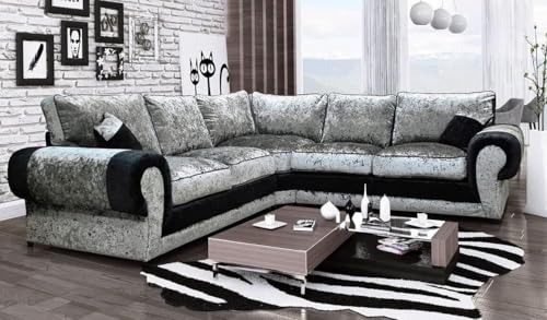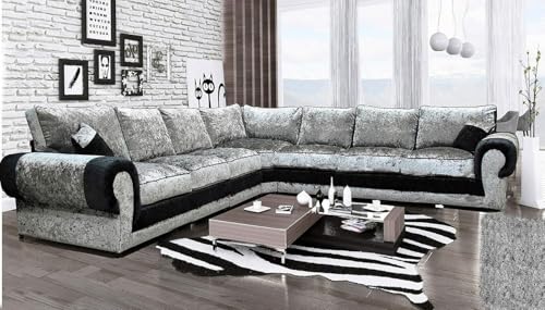 Luxury Crushed Velvet 7 Seater L Shape Corner Sofa for Living Rooms - Extra Large Sectional Sofa with High Back Cushions (Black/Silver)
