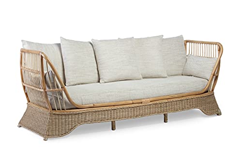 Desser Natural Rattan Day Bed Sofa – Fully Assembled Large Indoor Cane Wicker Daybed Settee with UK Made Cushions in Jasper Fabric – H92cm x W226cm x D85cm