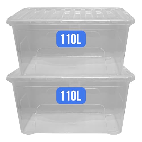 KMJ® 2 Pack Extra Large Plastic Storage Boxes with Lids – Sturdy & Clear Storage Boxes with Lid – Stackable Plastic Box with Lid– Nestable & Really Useful Box– 110L Capacity